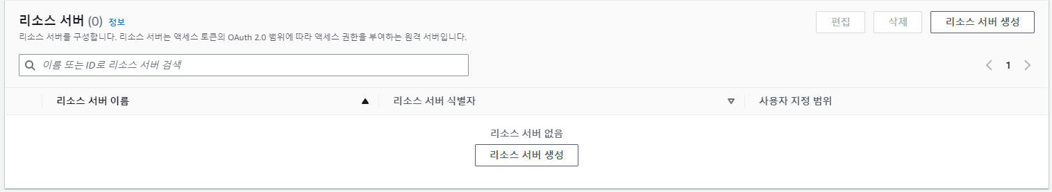 Cognito User Pool은 OAuth2의 서버의 역할을 하여 인증된 사용자에게 지정된 권한의 정보를 token에 넣어서 전달하게 된다. Custom Scope를 설정하기 위해서는 Cognito AWS Management Console 에서 User Pool의 설정을 들어가 앱통합 탭에 있는 리소스 서버를 생성하고 필요한 범위를 생성 관리할 수 있다.