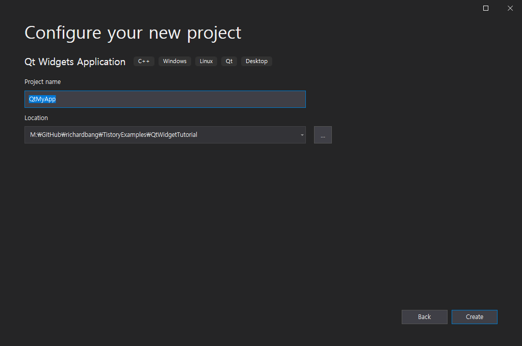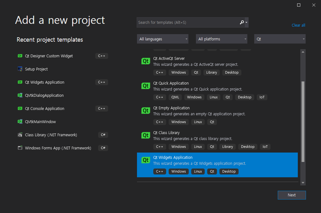 Custom Widget을 띄울 application 프로젝트를 QtWidgetTutorial 솔루션에 추가하여 생성합니다.