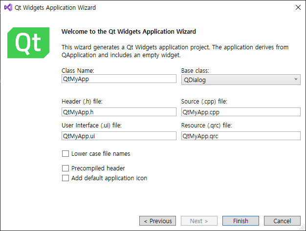 Qt WidgetApplicaiton 에서는 Base class를 3가지 형태로 제공하는데 간단하게 QDialog 로 만들었습니다.