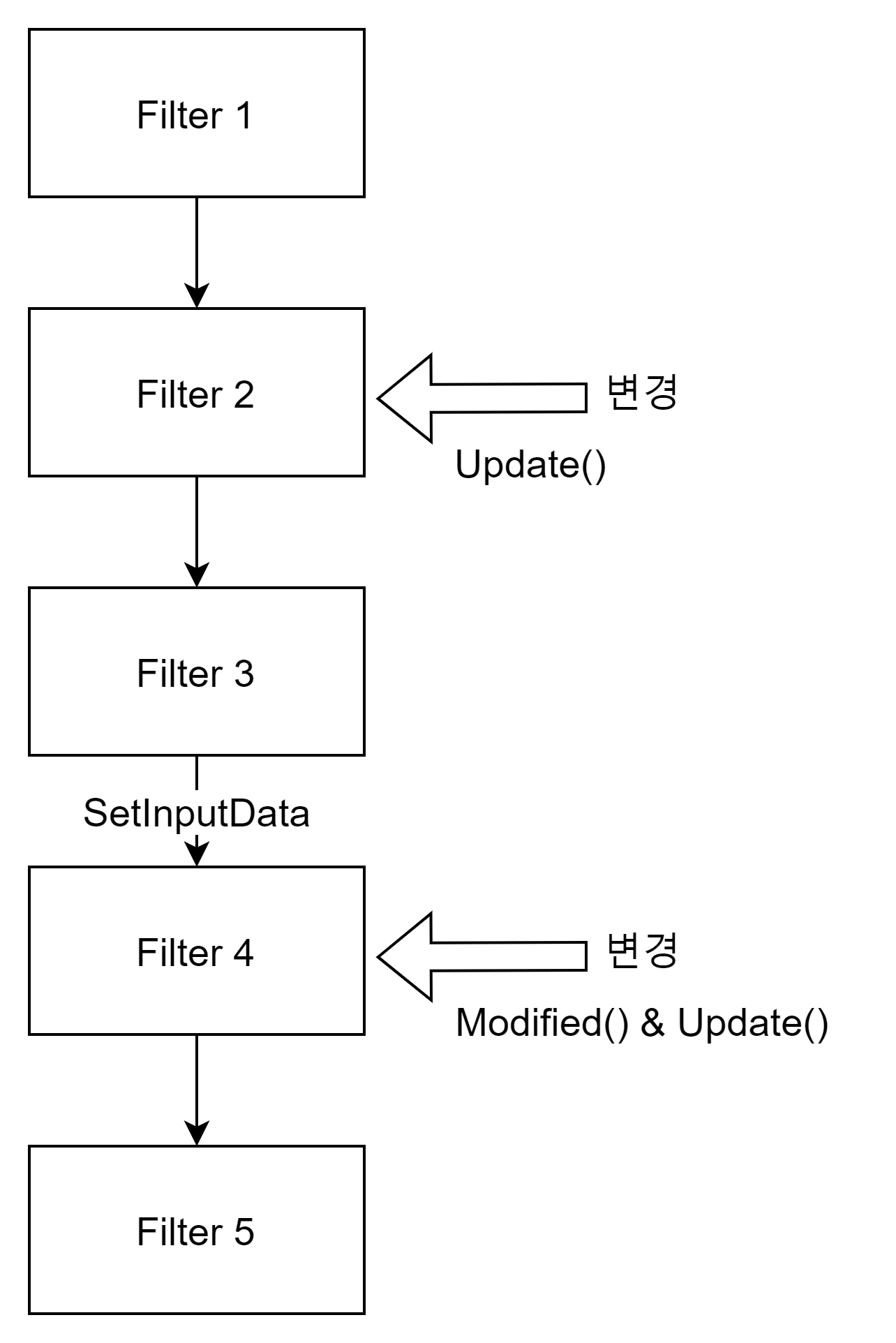 만약에 Filter 2와 같이 SetInputData 이전의 Filter에서 변경이 있을 경우에는 직접 Update를 수행한 후 Filter4에서 SetInputData를 다시 수행해서 업데이트를 해야한다. 그리고 SetInputData으로 데이터를 변경한 경우에는 MTime 이 업데이터 되지 않는 경우가 있다. 이럴 경우에는 Modified를 직접 호출해야 한다.